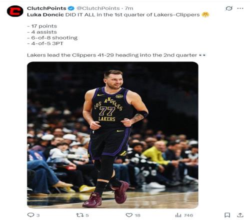 东契奇打快船是真的太猛了,4个三分球一个比一个难,一个比一个远,首节8中6,三分5中4,拿到17分4助攻2篮板,东契奇无愧同盟首节得分王。