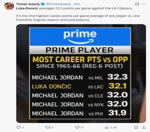 赛前快船记者晒出对阵LAC场均得分最高排行榜,乔丹场均32.3分第一,东契奇场均32.1分第二,以是东契奇打快船是有心得的,快船记者希望能限制住他。
