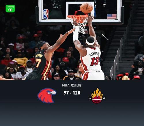 北京时间2月21日NBA 通例赛,亚特兰大老鹰对阵迈阿密热火 。半场老鹰51-57热火,最终老鹰97-128热火 。