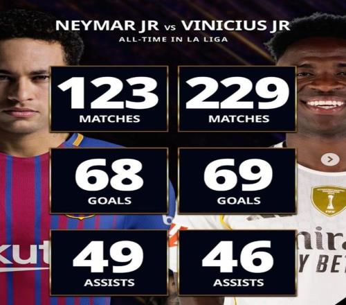 巴西天才西甲数据比照:内马尔123场68球49助 ,维尼修斯229场69球46助