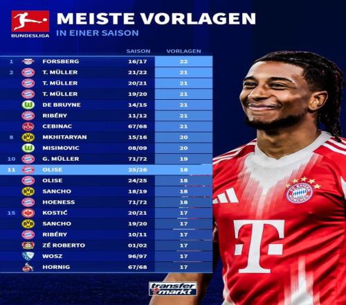 北京时间2月21日,来自德转的统计指出,拜仁慕尼黑边锋奥利塞距离德甲历史单赛季的助攻数纪录尚有4次之遥。