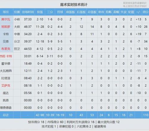 再看看魔术这边 ,贝恩是全队状态最好的 ,无奈第一个加时赛6犯离场。本场角逐 ,贝恩18投12中 ,三分9中5 ,罚球5中5 ,砍下34分4板3助2断!魔术状元班凯罗28投11中 ,三分2中0 ,罚球4中4 ,拿到26分14板8助4帽6失误。