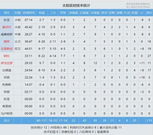 此役太阳投篮掷中率34.2% ,三分掷中率29.1% ,罚球掷中率70.8% ,真实掷中率44.3%。本赛季NBA所有获胜球队当中 ,太阳本场投篮和真实掷中率都是最低的。此役事后 ,太阳33胜24负仍居西部第七 ,领先第八勇士3.5个胜场。