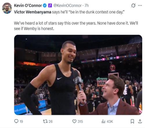 赛后文班亚马谈到自己的抡臂大风车,他体现自己未来有朝一日肯定会加入全明星扣篮大赛。