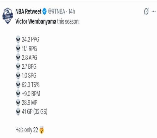 本赛季文班亚马场均28.9分钟,拿到24.2分11.1篮板2.8助攻1抢断2.7盖帽,掷中率51.1%,三分掷中率35.7%,真实掷中率62.3%,BPM值+9。