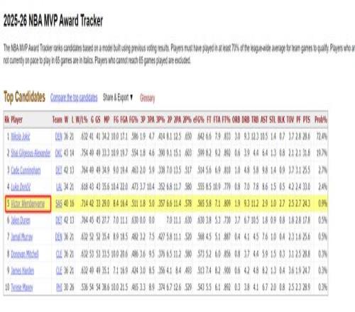文班亚马更强悍的地方在于,马刺队是西部第二的豪强,这让文班亚马的MVP概率排在同盟第五,仅次于约基奇、亚历山大、坎宁安、东契奇。从这个角度来看文班亚马入选最佳一阵险些是板上钉钉,只要文班亚马出战凌驾65场应该就是最佳阵容。