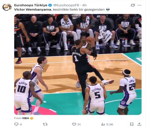 此役文班亚马海在主场完成了一次持球突破的拉杆抡臂暴扣,裸足2.24米的文班亚马还能完成云云炸裂的行动让不少球迷以为比全明星扣篮大赛还要有趣。
