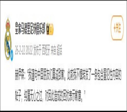 2月22日晚 ,西班牙皇家马德里足球俱乐部球员赫伊森就社交媒体宣布辱华贴文一事 ,向中国网友致歉。