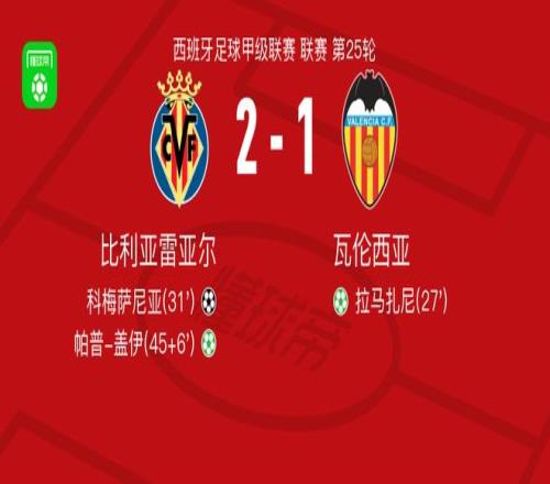 北京时间2月23日西班牙足球甲级联赛 联赛 第25轮,比利亚雷亚尔主场对阵瓦伦西亚 。比利亚雷亚尔科梅萨尼亚破门,帕普-盖伊破门 。瓦伦西亚拉马扎尼破门 。最终比分比利亚雷亚尔 2-1 瓦伦西亚 。