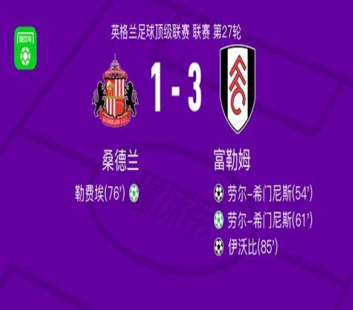富勒姆31桑德兰 ,劳尔希门尼斯双响 ,伊沃比传射