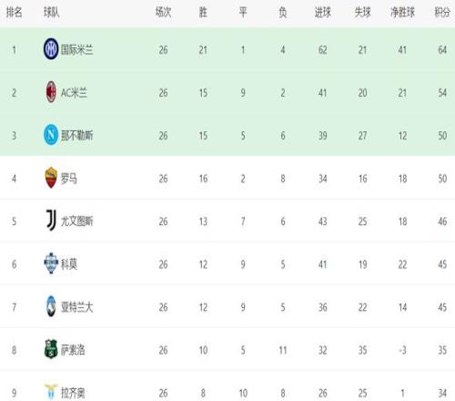 ÔÚ»ý·Ö°ñÉÏ £¬¹ú¼ÊÃ×À¼Ò£Ò£ÁìÏÈ¡£¹ú¼ÊÃ×À¼21ʤ1ƽ4¸º £¬Äõ½64·Ö £¬ÅÅÃû°ñÊס£¶øACÃ×À¼ÊäÇòºó £¬ÒÀÈ»ÊÇ54·Ö £¬ÅÅÃûµÚ2 £¬ÕûÕûÂäÎé¹ú¼ÊÃ×À¼10·Ö¡£¹Ú¾üµÄ¹éÊô»ù±¾Ã»ÓÐÐüÄîÁË¡£ÄDz»ÀÕ˹50·Ö £¬ÅÅÃûµÚ3¡£ÂÞÂíÓ®Çòºó £¬»ý·ÖÒѾ­×·Æ½ÄDz»ÀÕ˹ £¬Ò²ÊÇ50·Ö £¬ÅÅÃûµÚ4 £¬µ«ÓÉÓÚÓëÄDz»ÀÕ˹Á½»ØºÏ½»ÊÖÕ½¼¨´¦ÓÚÁÓÊÆ £¬Ö»ÄÜÅÅÔÚÄDz»ÀÕ˹ËÀºó¡£ÓÈÎÄͼ˹ֻÄõ½46·Ö £¬ÅÅÃûµÚ5 £¬±»ÂÞÂí˦¿ª4·Ö¡£¿ÆÄªºÍÑÇÌØÀ¼´ó¶¼ÊÇ45·Ö £¬ÅÅÃûµÚ6ºÍµÚ7¡£