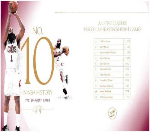同时本场是哈登生涯第772次单场砍下20+得分体现,乐成逾越名宿张伯伦升至NBA历史第10,安东尼以796场排名第九,詹姆斯1310场位列历史第一 。