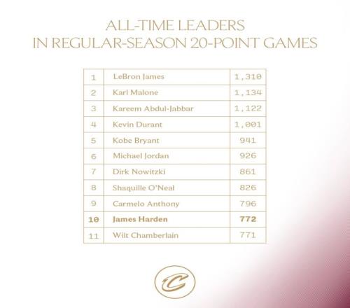 这场角逐哈登迎来里程碑,他完成772次20+升至历史第10,排在他身前的安东尼是796场。