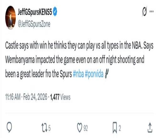 面临文班这样的体现 ,赛后卡斯尔赞美到:“文班是马刺的首脑 ,哪怕手感不佳 ,他也能对角逐带来重大的影响。”