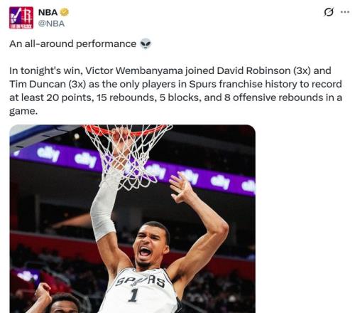 依附这样的体现 ,文班成为马刺队史第三位单场至少拿下20分15板8前场板5帽的球员 ,前两人是大卫罗宾逊与邓肯。