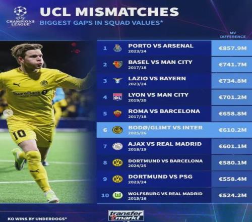 赛后数据耀眼得让人心寒:国米全队身价4.1亿欧元,首发总身价更是高达数亿,而博德闪灼全队身价仅4260万欧元。两队身价差高达6.1亿欧元,这在欧冠历史上足以排进“以弱胜强”的前十名。