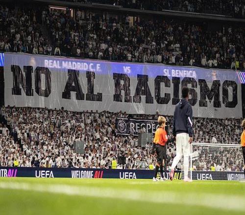 周三,在圣地亚哥?伯纳乌球场的赛前展示环节中,现场还悬挂了重大的“阻挡种族主义”横幅,看台上一名球迷却被拍到做出相关手势。