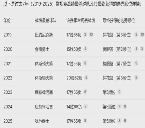 ÉÏÈü¼¾¾ôÊ¿17ʤ65¸ºÍ¬Ã˵¹ÊýµÚ1£¬ÓÐ14%µÄ¸ÅÂʳéÖÐ״Ԫǩ£¬52.1%µÄ¸ÅÂʳ鵽ǰ4˳룬µ«¾ôÊ¿×îÖÕÖ»³éµ½ÁË5ºÅÇ©¡£¶ÀÐÐÏÀ39ʤ43¸ºÍ¬Ã˵¹ÊýµÚ11£¬ÒÔ1.8%µÄ¸ÅÂʳéÖÐ״Ԫǩ¡£ÓÐÁ½Î»NBAÀϰ屬ÁÏ£¬¶ÀÐÐÏÀÕâ¸ö״ԪǩÊÇÄÚ¶¨µÄ¡£