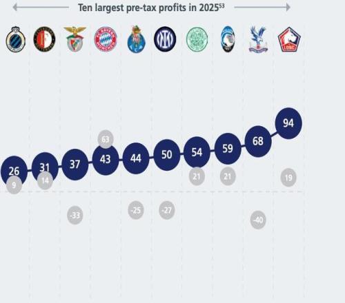 欧足联统计2025年欧洲税前盈利最多的10家俱乐部: