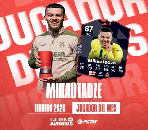 北京时间2月28日,官方新闻,比利亚雷亚尔先锋米卡塔泽中选西甲2月最佳球员 。