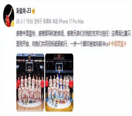 谢谢中国篮协,谢谢郭导和教练组,谢谢兄弟们对我的支持与信任!这两场角逐只是刚最先,向我们配合目的砥砺前行,一步一个脚印继续向前冲。