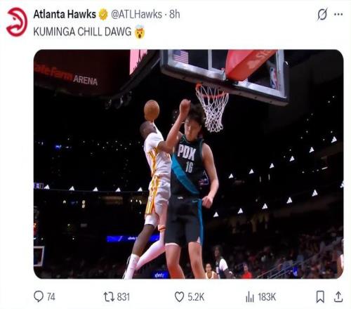 老鹰主场球迷也是杀人诛心:谢谢金州勇士队送给我们乔纳森-库明加。(此前勇士用库明加+希尔德换走了波尔津吉斯,但波尔津吉斯在勇士不温不火)
