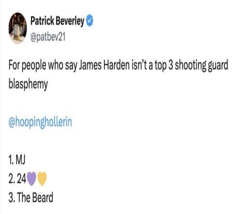 贝弗利写道:“那些说哈登不是同盟前三得分后卫的人简直是亵渎神明 。”