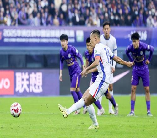 ↑2025年11月22日 ,上海申花队球员吴曦(前)在中超第30轮点球破门 。新华社记者 孙凡越 摄