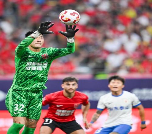 ↑2025年8月2日 ,成都蓉城队守门员刘殿座(左)在中超第19轮角逐中扑救 。新华社发(尹钢 摄)