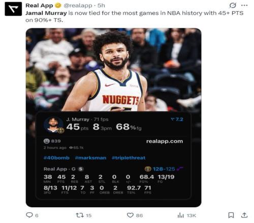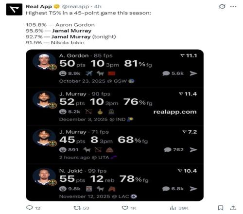 3.掘金本赛季拿到45分以上真实掷中率凌驾90%的球员有三人:约基奇、穆雷(2次)、戈登;