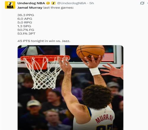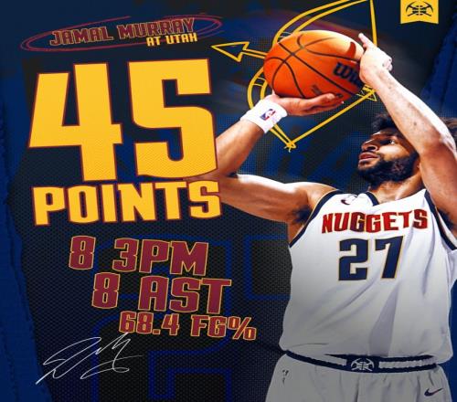 他在第三节三分7中5拿到18分1抢断 ,小节2中2+罚球6中6拿到10分 ,整个下半场拿到28分 。而约基奇全场角逐只拿到22分12篮板5助攻 ,此役掘金就是靠穆雷才拿下的 。
