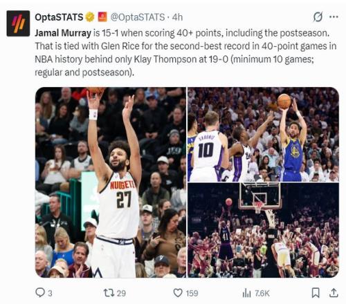 4.本赛季穆雷拿到4次40+ ,掘金则拿到4胜0负;