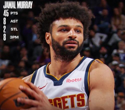 此役贾马尔-穆雷37分钟 ,19中13 ,三分13中8 ,罚球12中11 ,拿到45分8助攻2篮板2抢断7失误 ,掷中率68.4% ,三分掷中率61.5% ,真实掷中率69.4% ,正负值+2 。