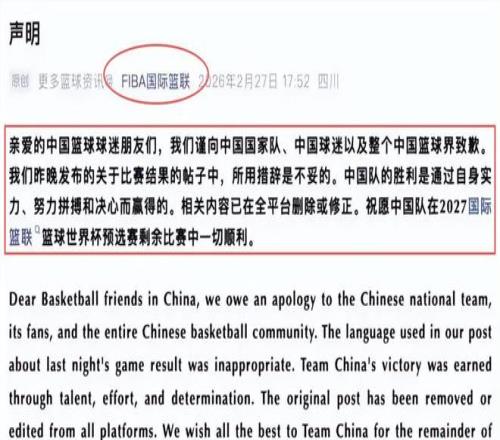 迫于强盛舆论压力 ,FIBA于2月27日紧迫宣布中英文双语致歉声明 ,认可用语严重失当 ,肯定中国队技战术体现与顽强意志 ,并悄然撤下原帖、替换为修正后文案 。