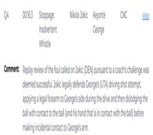 别的,在角逐竣事前16.3秒,掘金队乐成挑战了约基奇的防守犯规,裁判报告显示这次挑战乐成无误,约基奇在防守乔治突破上篮时为正当防守,突破历程中他用前臂合理接触乔治身体侧面,随后先遇到球及持球手将球破损,之后才无意接触到乔治的手臂。
