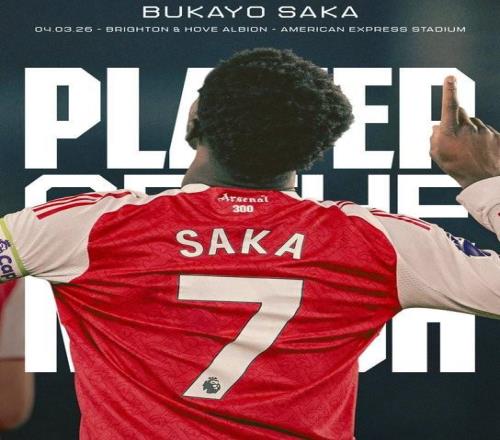在今天破晓举行的英超第29轮角逐中,阿森纳客场1-0击败布莱顿,赛后,打入制胜进球的萨卡被阿森纳官方评为本场角逐队内最佳球员。