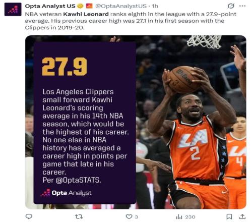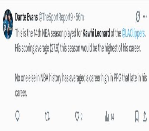 美记DanteEvans写道:伦纳德在职业生涯第14个赛季拿加入均27.9分创立生涯新高,这是NBA历史上首位在生涯第14个赛季拿加入均最高分的纪录,前无昔人。