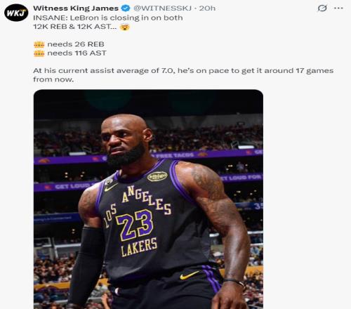 41岁的勒布朗也会迎来多项里程碑的时刻 ,他距离12000篮板、12000助攻只差26个篮板与116次助攻 ,凭证詹姆斯场均7个助攻来看他只需要17场角逐就凌驾这两里程碑。