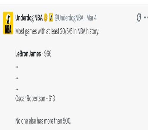 对阵鹈鹕拿到21+7+7后 ,詹姆斯生涯已经拿到966场20+5+5继续刷新历史第一 ,奥斯卡-罗伯特森613场20+5+5历史第二 ,其余的球员没有一人抵达500场。勒布朗-詹姆斯有多项数据将告竣历史第一 ,这就是GOAT的魅力 ,历史最长的河果真名不虚传。