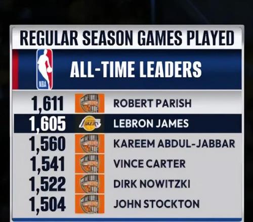 詹姆斯已经完成1605场角逐 ,距离帕里什1611场只差6场 ,詹姆斯逾越帕里什只需要7场角逐 ,詹姆斯又要升历史第一了。