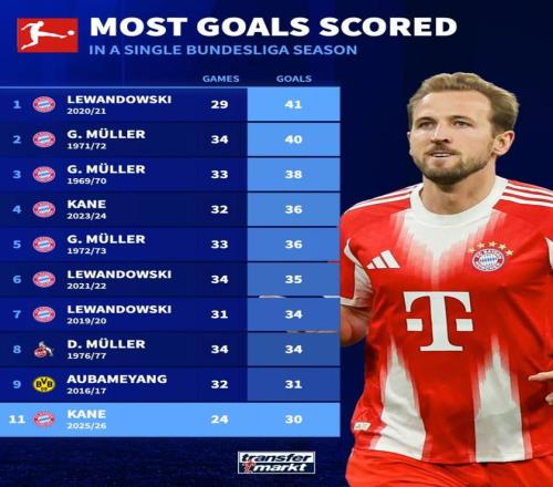德甲单赛季进球榜:莱万41球第1,凯恩本赛季24场30球第11位