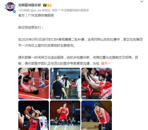 广州男篮官方伤情报告写道:“俱乐部第一时间将(郭)艾伦送往医院 ,经起源检查诊断 ,伤病位置为左膝前交织韧带。现在俱乐部医疗团队正与顶尖的医疗专家细密相同 ,为他制订后续康复计划 ,我们将确保艾伦获得最好的康复治疗。”