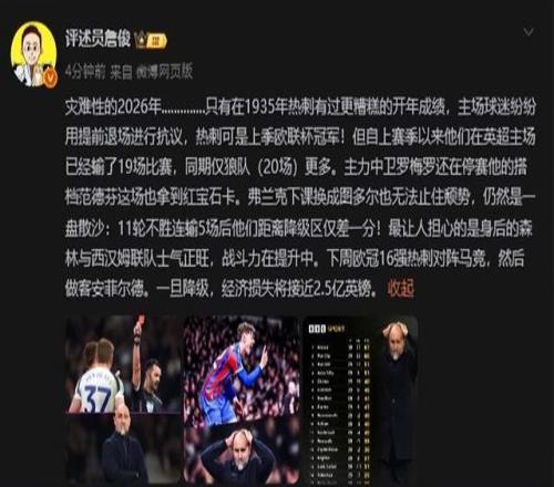 ¡°ÔÖÄÑÐÔµÄ2026Äê..............Ö»ÓÐÔÚ1935ÄêÈÈ´ÌÓйý¸üÔã¸âµÄ¿ªÄêЧ¹û£¬Ö÷³¡ÇòÃÔ·×·×ÓÃÌáǰÍ˳¡¾ÙÐп¹Ò飬ÈÈ´Ì¿ÉÊÇÉϼ¾Å·Áª±­¹Ú¾ü£¡µ«×ÔÉÏÈü¼¾ÒÔÀ´ËûÃÇÔÚÓ¢³¬Ö÷³¡ÒѾ­ÊäÁË19³¡½ÇÖð£¬Í¬ÆÚ½öÀǶӣ¨20³ ¡£©¸ü¶à ¡£¡±