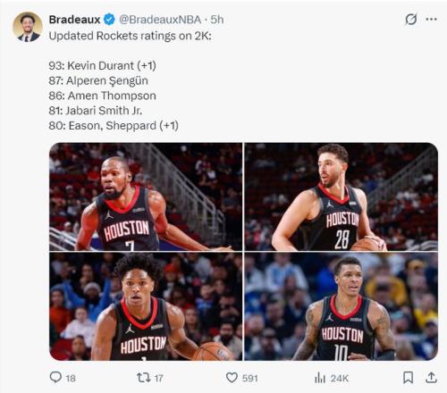 赛前,火箭记者Bradeaux晒出2K能力值变换,伊森与谢泼德都+1升至80,杜兰特也+1升到93,近期伊森与谢泼德的体现很是精彩 。