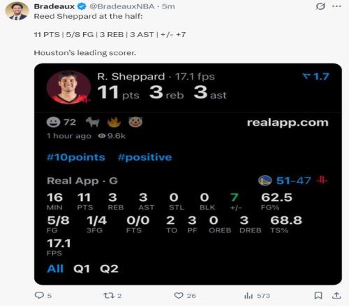 整个上半场除了谢泼德外只有杜兰特一人上双拿到10分3篮板1助攻,史女士4中0+伊森7中0+申京6中2都体现不佳,阿门中规中矩拿到8分6篮板,奥科吉则掷中两个三分球拿到6分 。