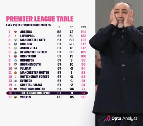 北京时间3月6日,英超联赛第29轮,热刺在主场1-3不敌水晶宫。本赛季迄今为止,热刺29场角逐7胜8平14负积29分,暂列英超积分榜第16位。据着名数据平台Opta统计,自2024/25赛季以来,在17支始终加入英超联赛的球队中,只有狼队的总积分比热刺低。
