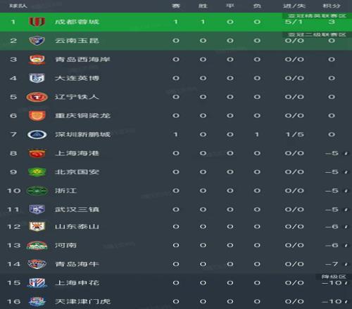 随着成都蓉城51大胜深圳新鹏城,中超最新排名出炉!蓉城第1领跑