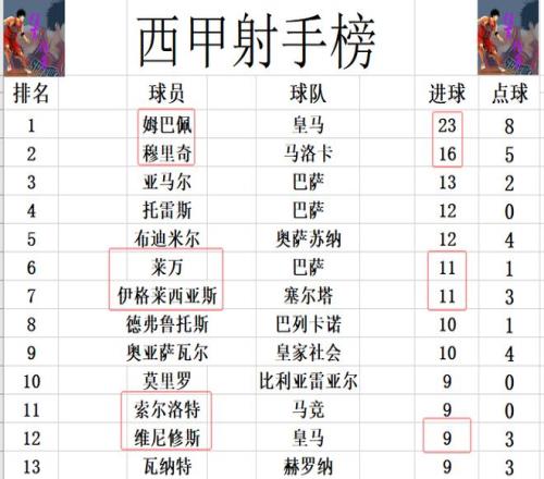 射手榜方面,姆巴佩继续缺阵,照旧23球领跑,不过他的优势照旧有点大,榜首位置暂时没有人能威胁到,第2的穆里奇差姆巴佩7球。伊格莱西亚斯今天打入一球后,追上莱万,11球并列第6。维尼修斯无力破门,照旧和索尔洛特等人9球恰恰挤入前十。