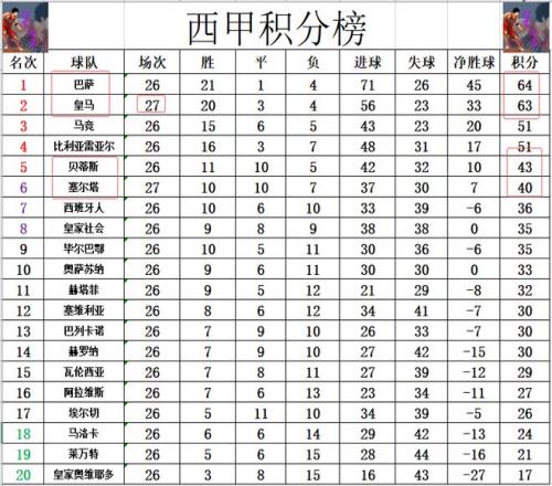 积分榜方面,皇马先赛绝杀赢球,终于是止住了连败的颓势,暂时差巴萨1分,照旧稳居第2。塞尔塔无力在皇马身上抢到分数,照旧差贝蒂斯3分,无缘冲进前5。
