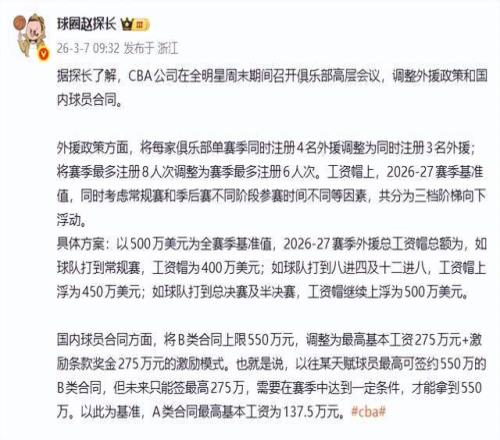 北京时间3月7日新闻,凭证著名博主“球圈赵探长”报道,CBA外助新政重磅落地!2026-27赛季起,外助注册规则与人为帽周全重构,俱乐部迎来“精兵简政”新时代。